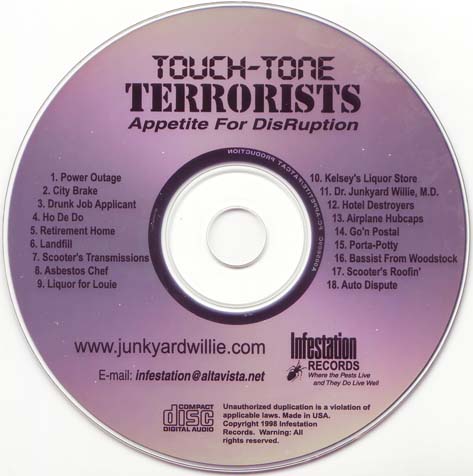 IMPORTANT NOTE: All inventory of "Touch-Tone Terrorists - Appetite for DisRuption" CD's inside shrink wrapped jewel cases with paper tray card inserts has sold out for good. There is still an excess inventory of bulk stacked CD's only. These are brand new CD's that are sold inside of plain protective paper sleeves exclusively via this website. These are the same exact professionally manufactured CD's that were sold inside of the jewel case product.